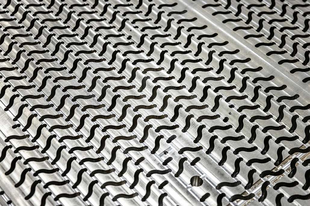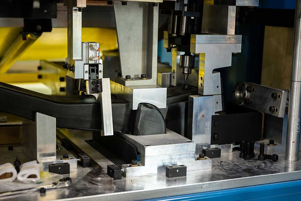 Our customer needed to produce two versions of a composite automotive part that required the routing of 100 holes and the application of 65 float nuts along with some rivet studs. In addition, they wanted a fully automated solution with +0.25mm tolerance on the holes, zero dust emission and a cycle time of just over three minutes. The customer thought it would take four machines to accomplish this.