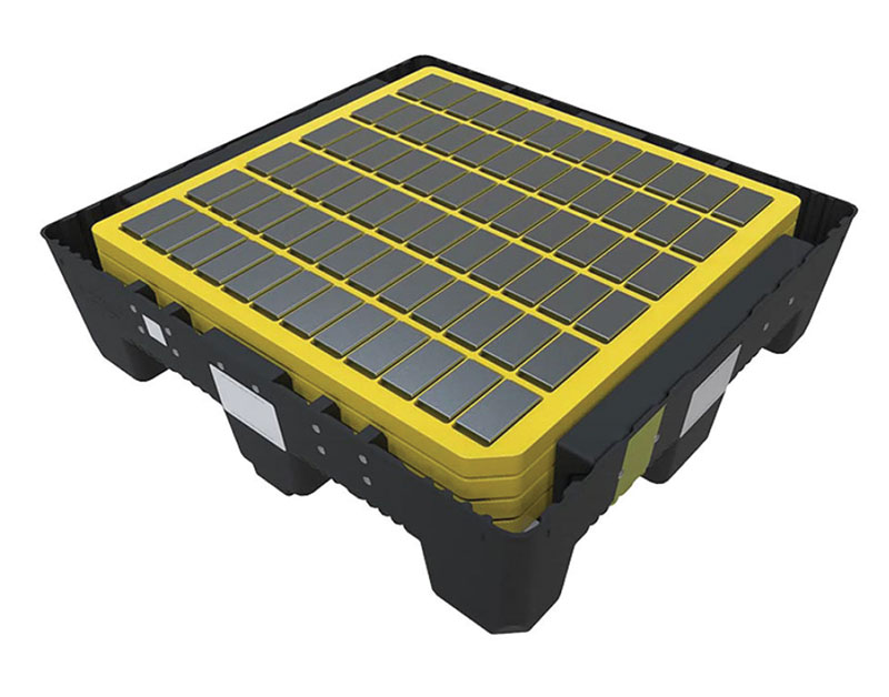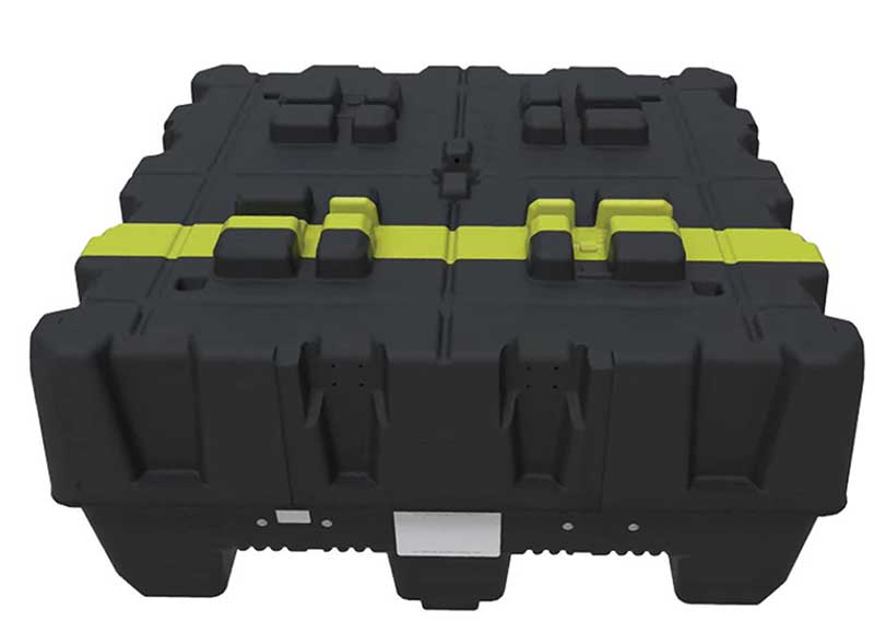 A major North American automotive supplier asked TriEnda to manufacture a reusable shipping container for the battery packs used to power battery electric vehicles (BEVs), one that would meet demanding UN criteria for shipment of dangerous goods. Constructed of ABS (Acrylonitrile Butadiene Styrene) and steel substructure for strength, the container must support robotic loading and unloading of the 37 compartmentalized trays within, each carrying 16 relatively soft, liquid-filled battery cells for a total of 592 per container.