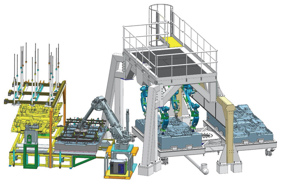 Tooling Technology, a Tooling Tech Group company, developed an automated transfer system that integrated with the automated forming line to move the carpet from the forming cell, rotate it 180 degrees for proper orientation, and then transfer it to the waterjet trimming machine. All of this was done hands-free via a mechanical gripper system, a turn style and indexing table, and a robot arm.