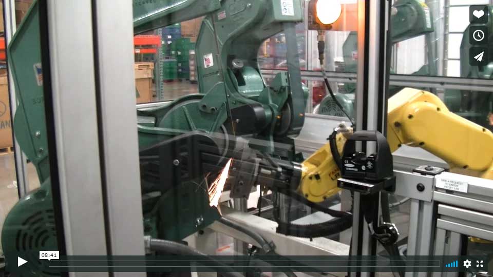 In our process, the operator loads the component into the drill where six holes are drilled. The operator then takes the part and puts it into a loading nest where the robot picks up the part and moves it under a stationary dispensing head that applies the glue for the bracket reinforcements. While the glue is being applied, the operator is loading the brackets into the next station. Once these actions are completed, the robot then loads the part into the nest at the manual station and the assembly press closes automatically to complete the bonding process. A mix of two to three operators and one robot results in an efficient cycle time of 3 to 3.5 minutes