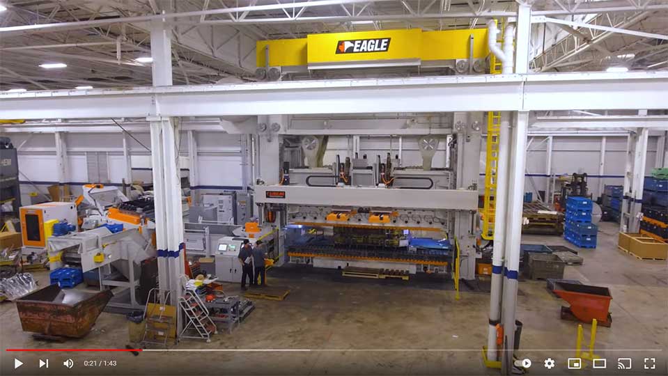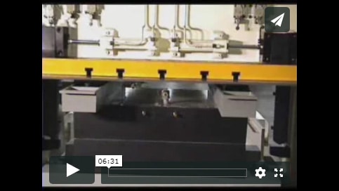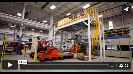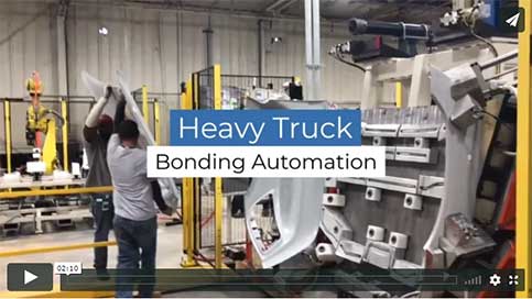 In this process, the heavy truck components (about 5-ft x 7-ft in size) are kept in a glue/bond apply station where a robot travels along a shuttle applying the adhesive to the different stations. The operator then manually loads the components in the front half of the cell and six components on the other side of the cell. The side with six components pivots up and is merged with the stationary side with the three components. The cycle then starts where cylinders are engaged to apply the pressure to finalize the bond