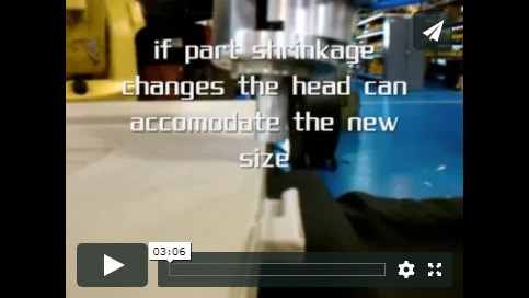 The handling robot then moves the part to the rivet nut station where two robots apply 66 float nuts, fed to the robots via a pneumatic tube. The nuts go in and are crimped using amperage as an indicator if the nut is properly secured. At the end of this process, all six robots communicate with the material handling robot to determine good or bad part.