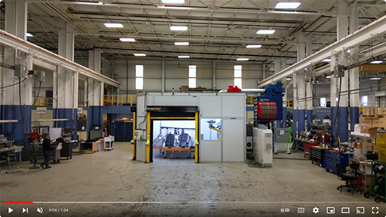 Tooling Tech developed a solution that could route all the holes in a single orientation during a continuous process while using a minimum amount of floorspace. The process starts with the operator manually loading the part on a wall fixture where the automated cycle then starts. The part is clamped in place, the part style verified via a sensor, and several holes are drilled. The wall then rotates 180 degrees and a handling robot picks up the part and places it into the route cell where four robots cut about 65 holes. Each robot has a vacuum unit at its head and collects the dust during the routing process.