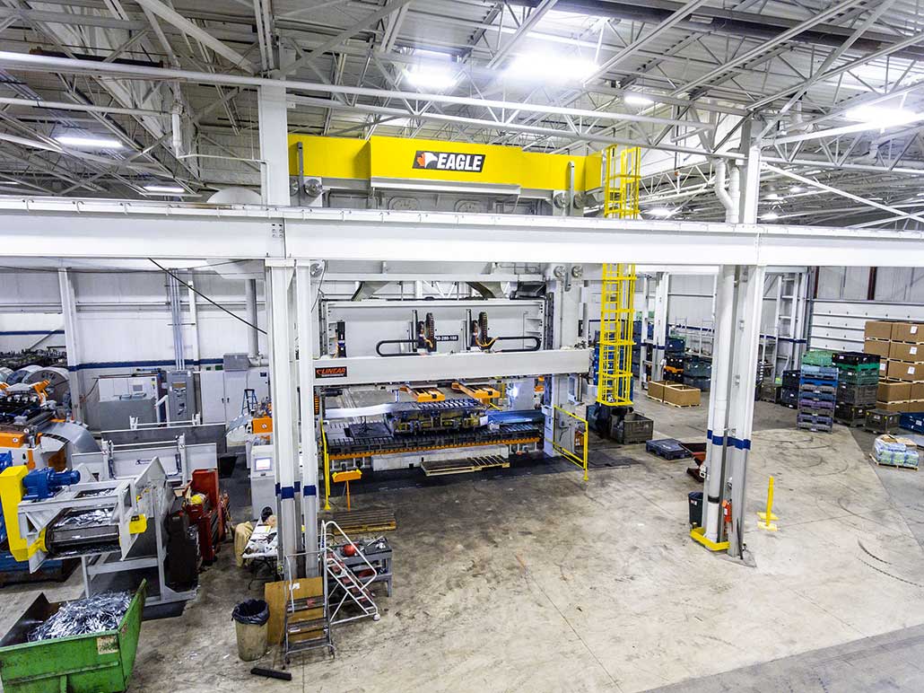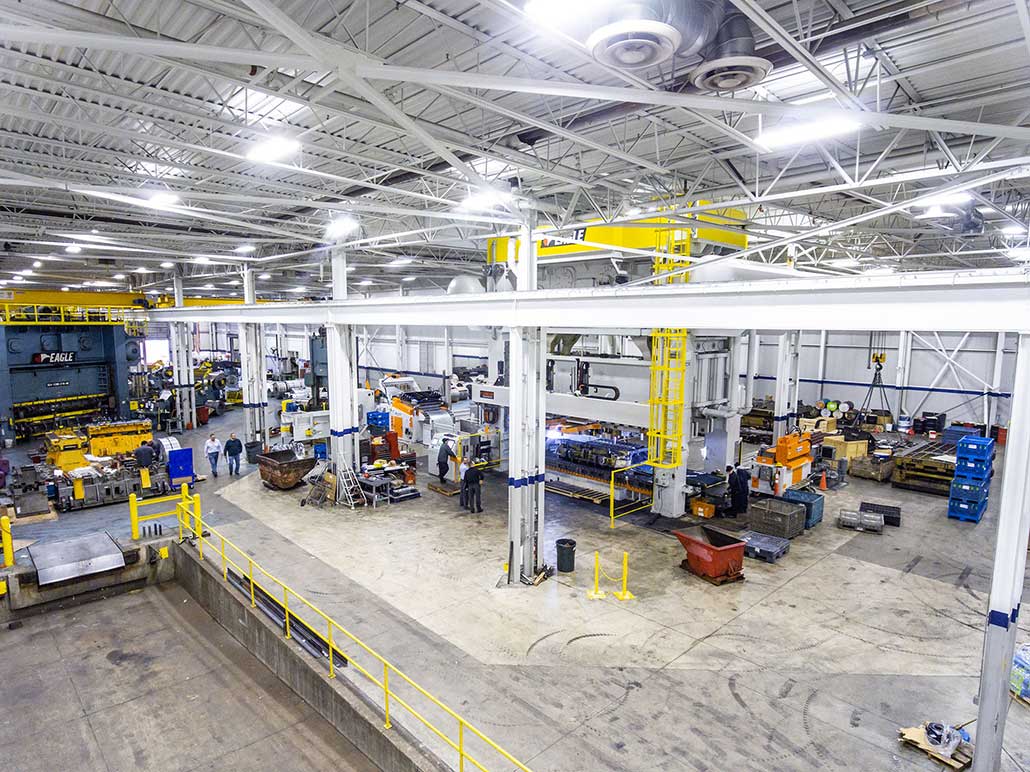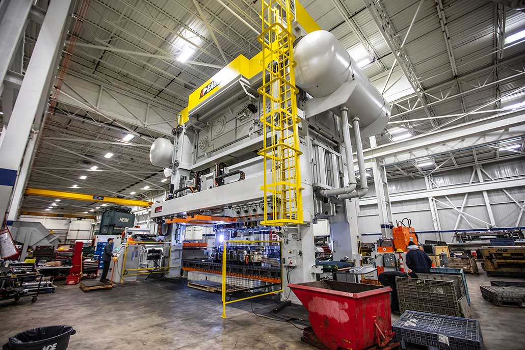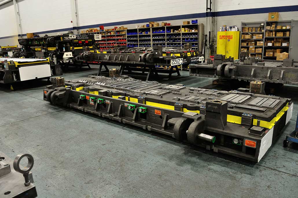 In this process, the heavy truck components (about 5-ft x 7-ft in size) are kept in a glue/bond apply station where a robot travels along a shuttle applying the adhesive to the different stations. The operator then manually loads the components in the front half of the cell and six components on the other side of the cell. The side with six components pivots up and is merged with the stationary side with the three components. The cycle then starts where cylinders are engaged to apply the pressure to finalize the bond