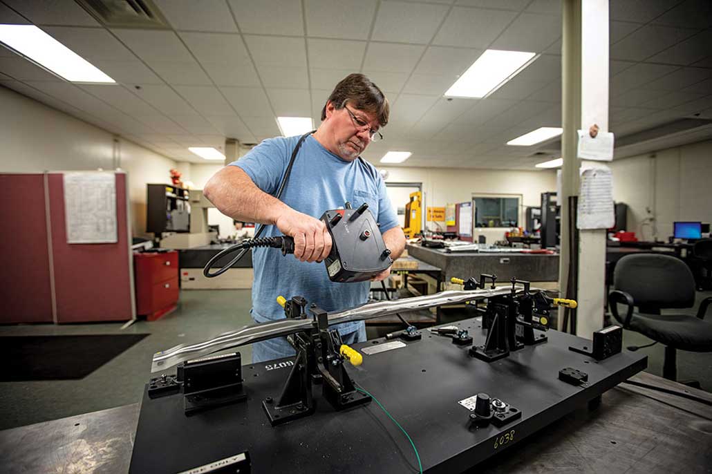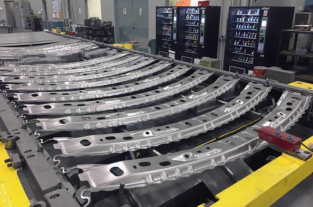 In our process, the operator loads the component into the drill where six holes are drilled. The operator then takes the part and puts it into a loading nest where the robot picks up the part and moves it under a stationary dispensing head that applies the glue for the bracket reinforcements. While the glue is being applied, the operator is loading the brackets into the next station. Once these actions are completed, the robot then loads the part into the nest at the manual station and the assembly press closes automatically to complete the bonding process. A mix of two to three operators and one robot results in an efficient cycle time of 3 to 3.5 minutes